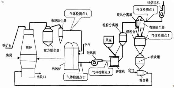 (1)监测点1:高炉煤气阐发,CO和CO2,节制高炉炉况和收受接管动力气;