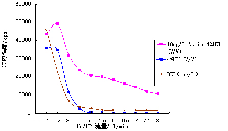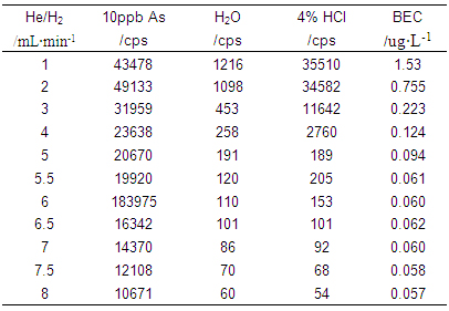 仪器起首在规范形式下停止参数优化(操纵10μg·L-1的Li、Co、In、U、Ce调谐液对仪器任务参数停止调理,使仪器活络度高,同时氧化物及双电荷产率小于3%);再开启He/H2碰撞反映气,慢慢增大He/H2流量,测试超纯水、4%HCl及10μg·L-1 As(4%HCl介质)在75amu处的呼应旌旗灯号,计较其背景等♓效浓度(具体数据见表1及图1);并操纵As标液进一步优化He/H2流量,获得仪器任务♑参数如表2所示。