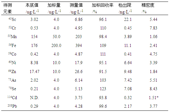 在仪器优化任务参数前提下,对样品溶液及加标样液停止测试,计较其加标收受接管率;对样品空缺溶液平行测定7次,以三倍空缺旌旗灯号规范误差/活络度对应的浓度为检出限;同时对样品溶液平行测定11次(距离2min),计较其绝对规范误差,考查精密度,数据见表4。各元素检出限在0.4🥂1-22.07ng/L之间,加标收受接管率在93.82%-123.10%之间,精密度在1.06%-8.43%之间。